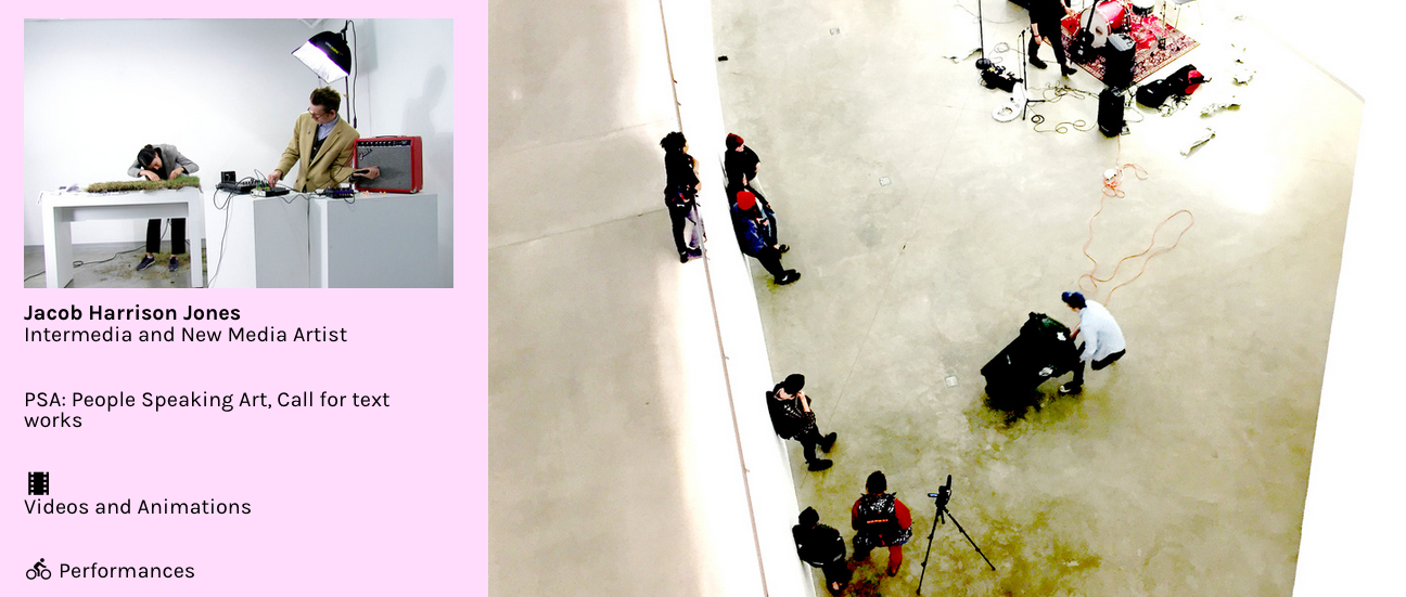 Jacob Harrison Jones (Jake Jacobs) is a queer intermedia artist whose work is invested in sound, video, performance and cultural animation. They earned a BFA from the University of Central Oklahoma in New Media, where they emphasized in avant-garde cinema and video art. Born and raised in Oklahoma, Jacobs toured across the United States in punk bands before moving to Iowa City for graduate school in 2018.