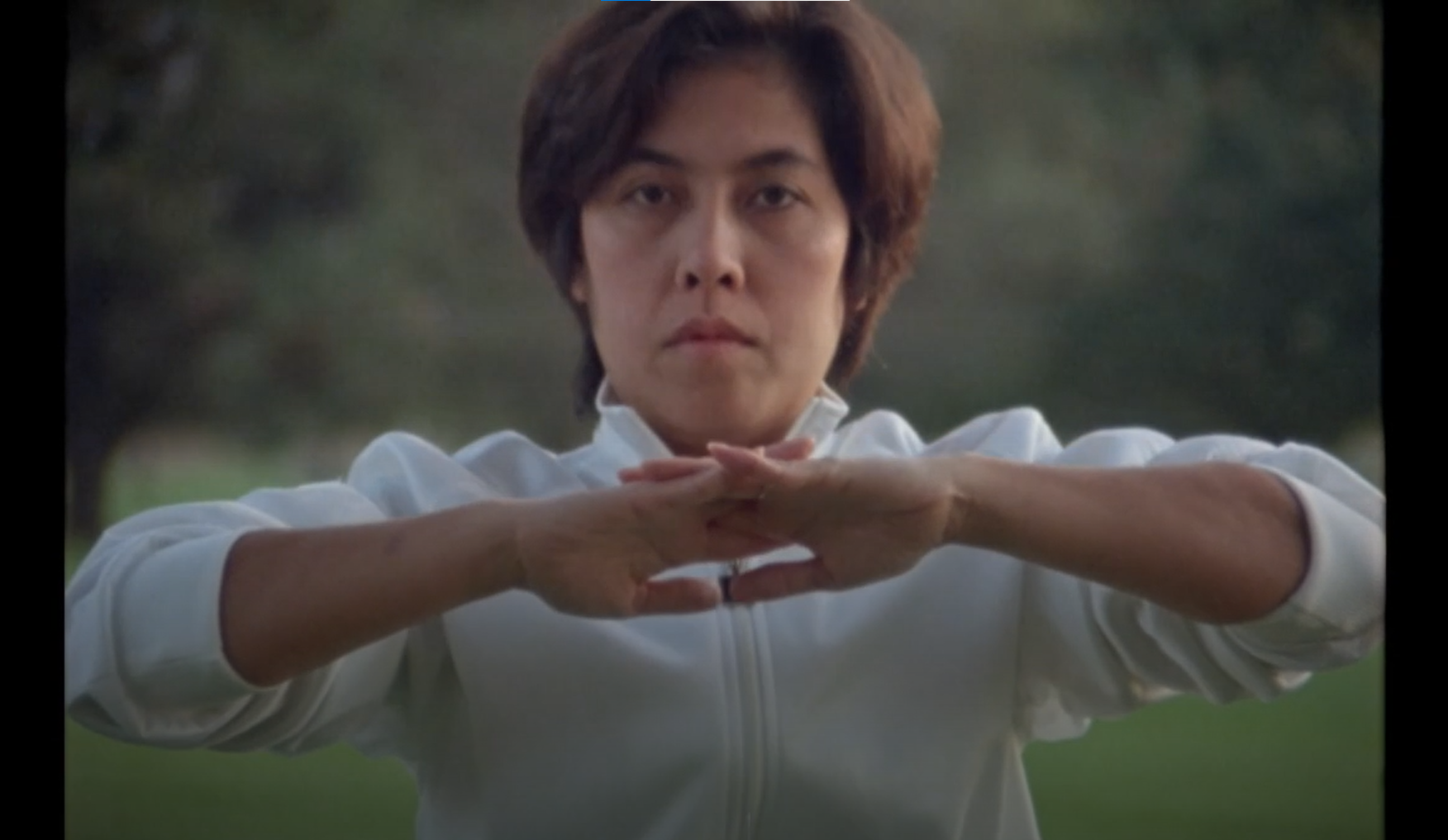 A third voice is now heard, conducting a mini-interview with the director on what criteria she selects people to be interviewed for this film. We later find out this third voice belongs to that of an American friend and fellow student of Trinh’s. The visual accompaniment to this is a woman outside somewhere green, freed from the previous artificial interiors. This woman moves her hands up and down on screen and focuses her gaze directly down the lens of the camera. She focuses our attention on the choices being made and why Trinh is interrogating them.